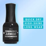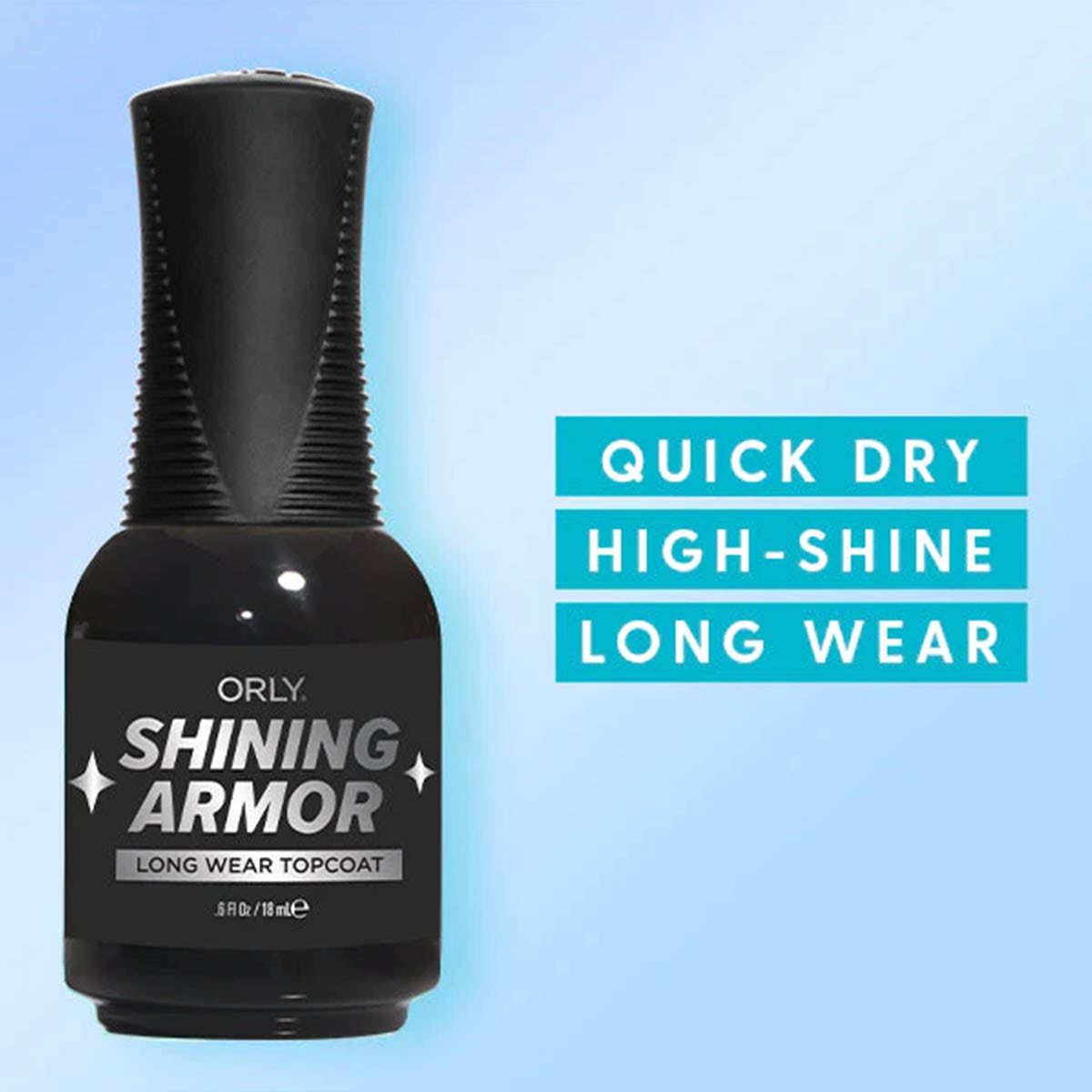 Shining Armor er en profesjonell topplakk utviklet for ekstra glans og varighet. Den danner et slitesterkt, blankt lag som beskytter neglelakken mot slitasje og holder fargen frisk i opptil 10 dager når den brukes sammen med ORLY Bonder og ORLY Lacquer.