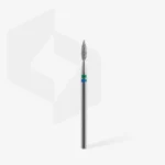 Profesjonell diamantbit i spiss flammefasong med medium/grov blå-grønn grit for effektiv behandling av neglebånd, laterale neglefolder og hardere hudområder. Perfekt til presist og kraftigere detaljarbeid.