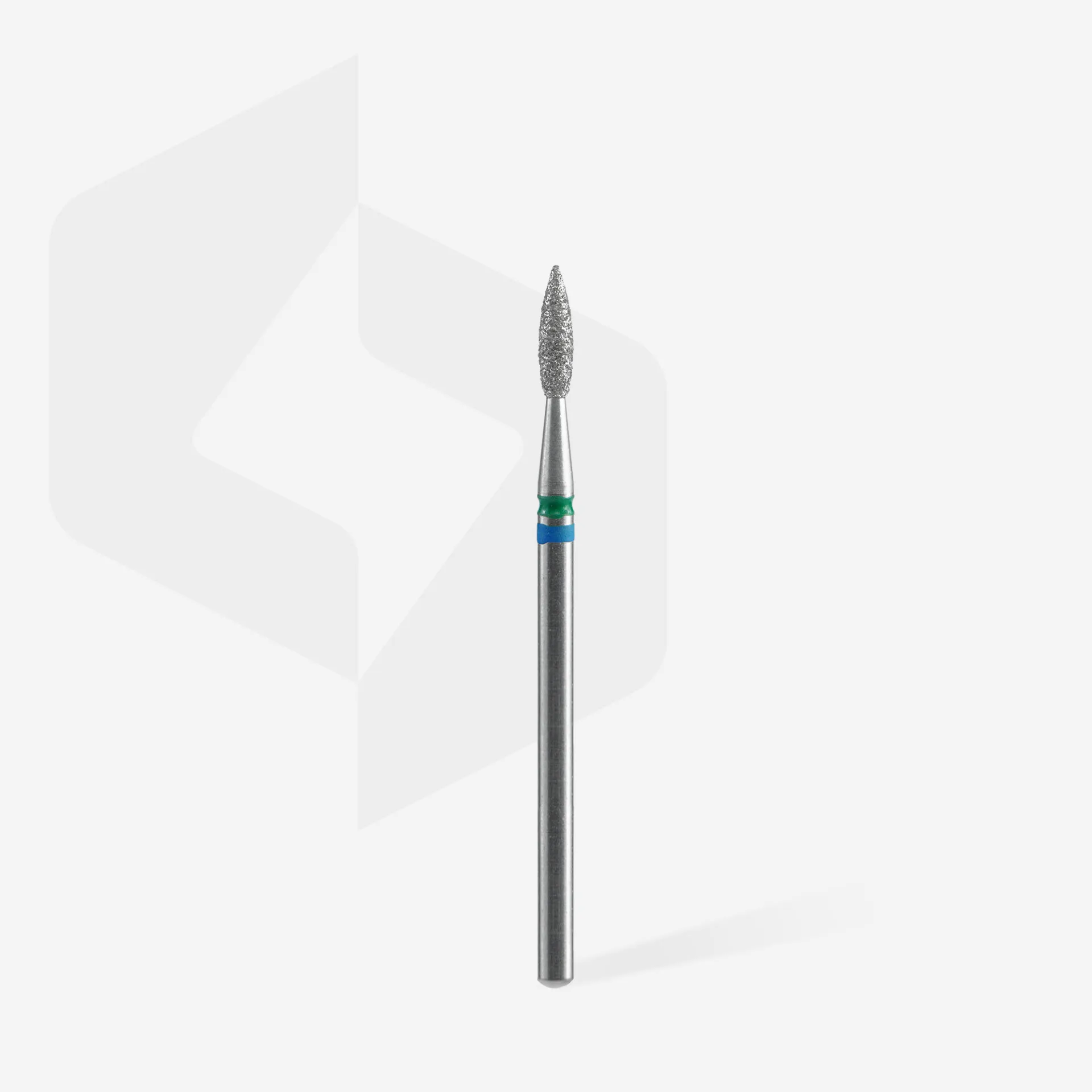 Form: Spiss flamme | Materiale: Diamant | Grit: Medium/grov (Blå-grønn) | Diameter: 2,1 mm | Arbeidsdel: 8 mm