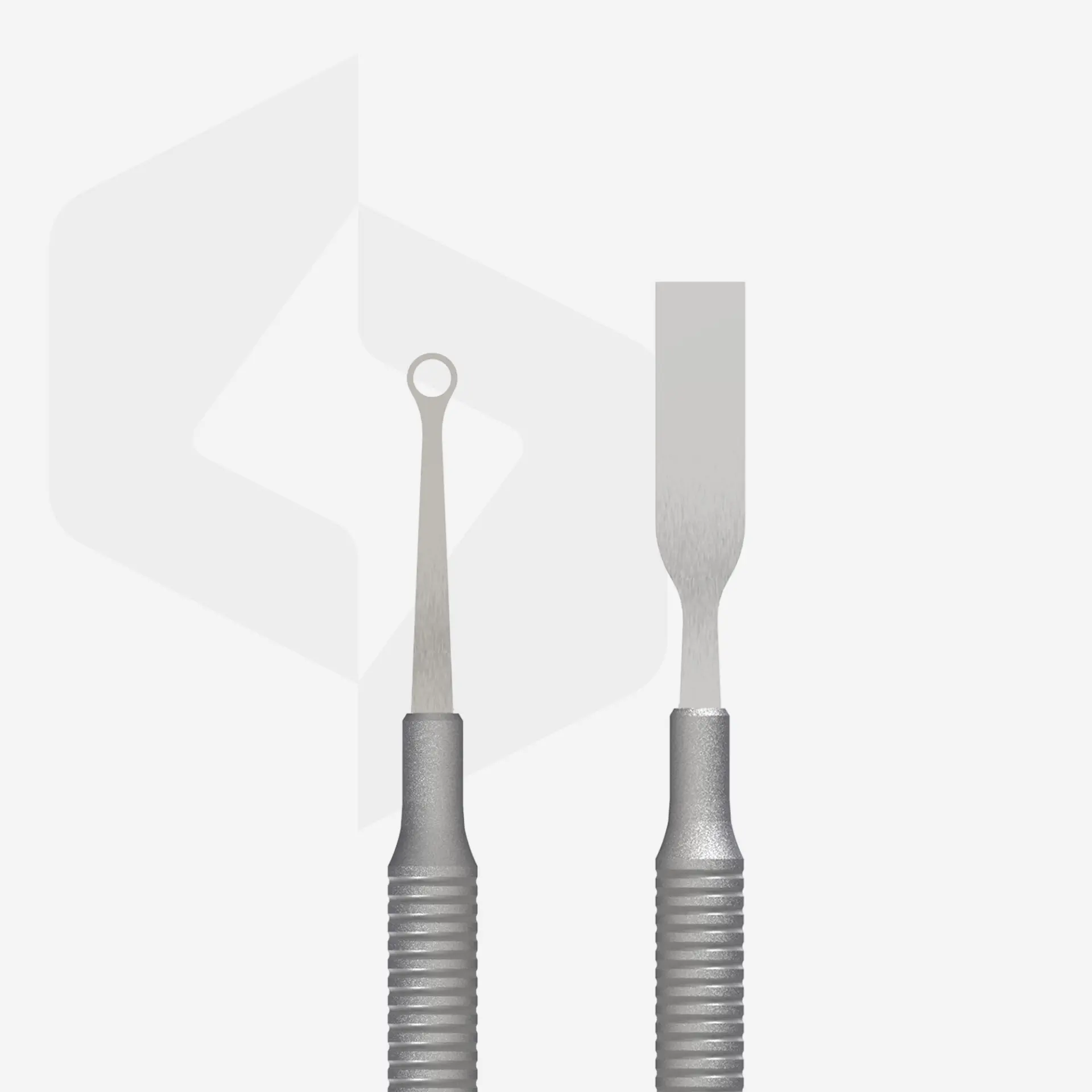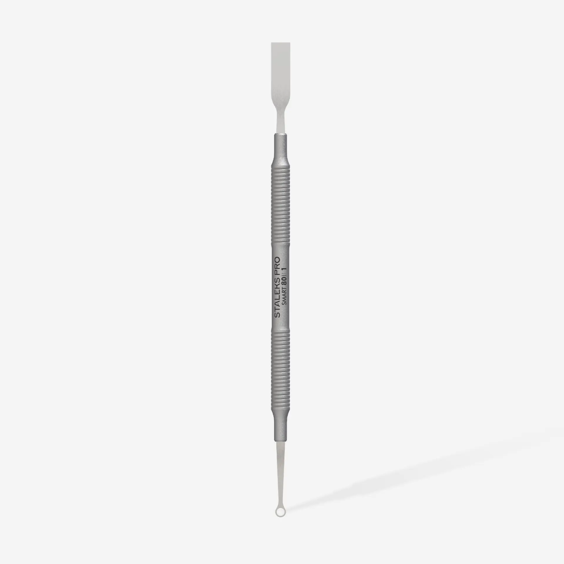 Staleks Pro Ring Pusher SMART 80 TYPE 1 kombinerer en presis flat pusher for løfting og skyving av neglebåndet med en ringformet ende som fjerner pterygium skånsomt og sikkert uten å skade negleplaten. Begge arbeidsender er manuelt slipte for optimal kontroll og presisjon.